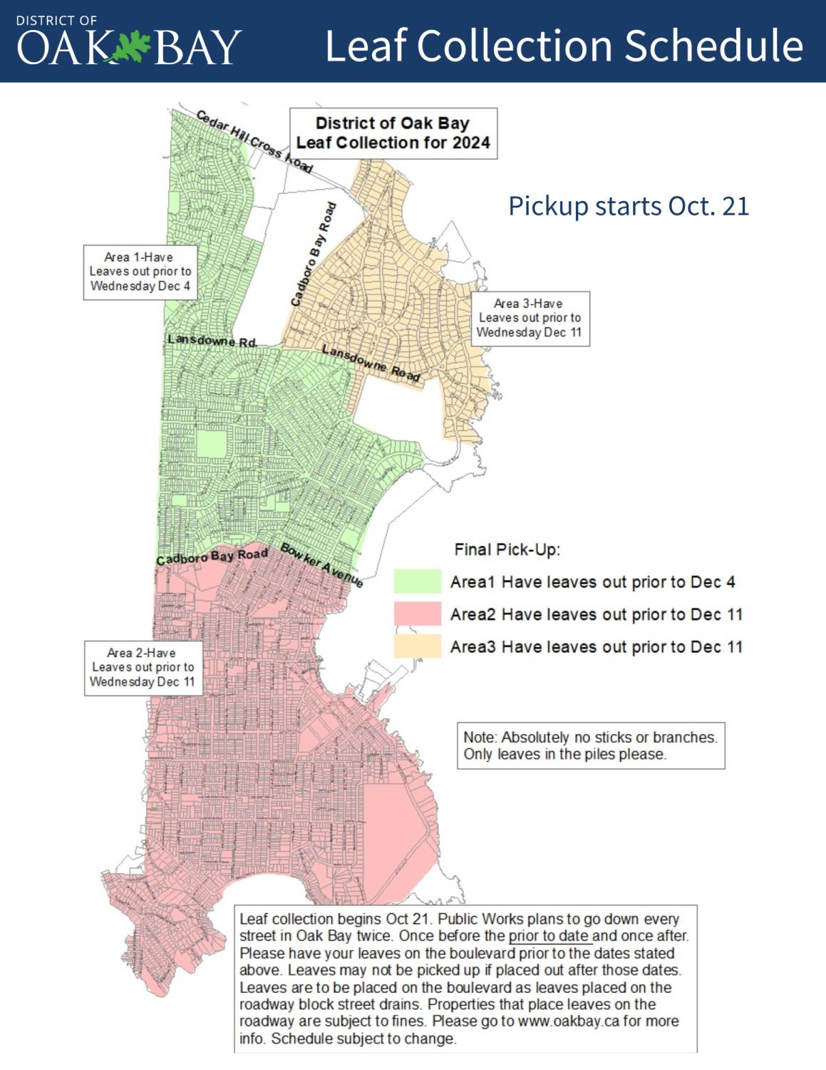 Leaf pickup in Oak Bay takes place yearly, from mid-October to mid-December, weather permitting. Specific areas will also be picked up according to the schedule in the map below: